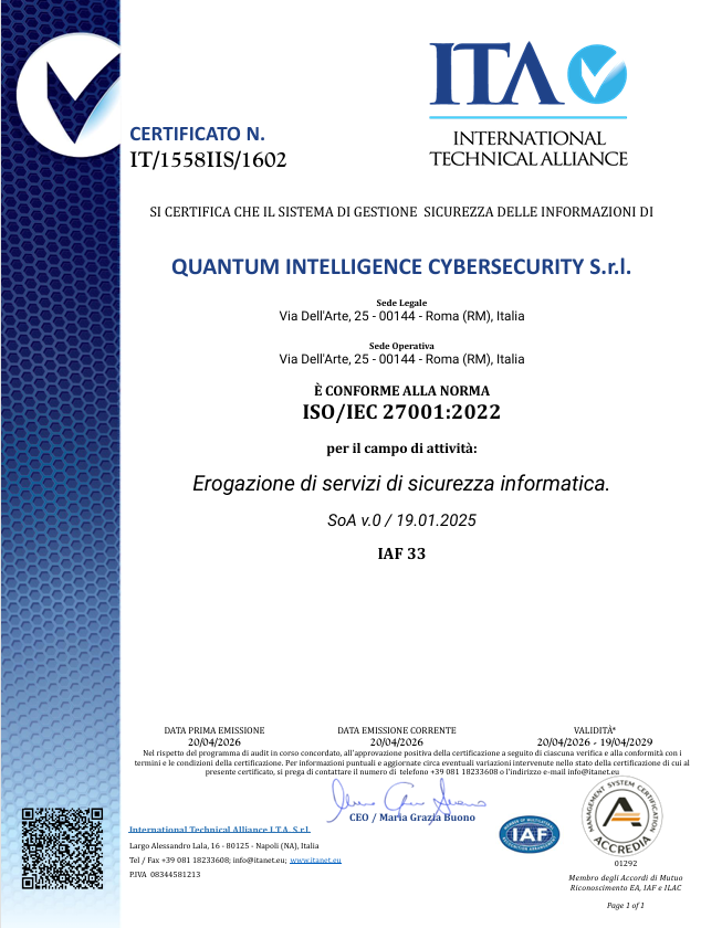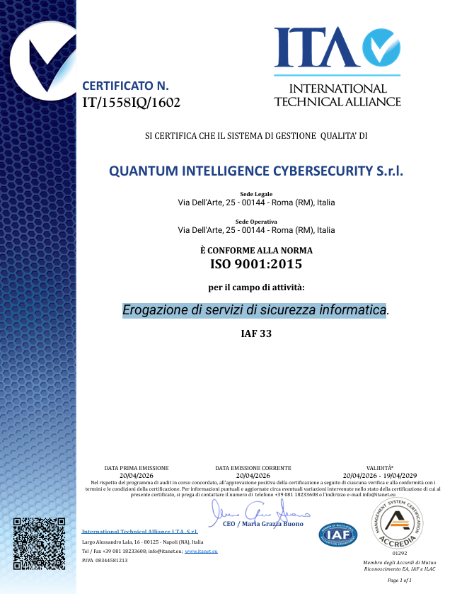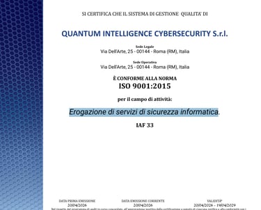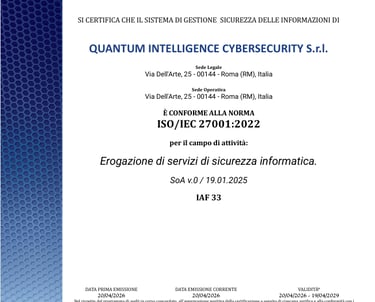 Emessa per il campo di attività: Erogazione di servizi di sicurezza informatica.